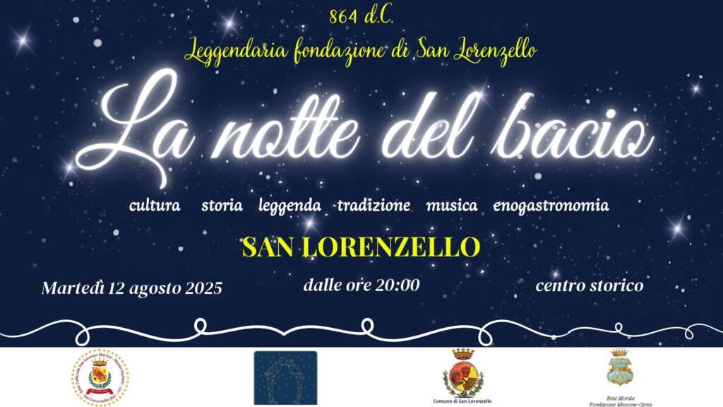 “La Notte del Bacio è un inno alla bellezza e all’identità di San Lorenzello, che intreccia memoria, tradizione e futuro. Invitiamo tutti a viverla con la stessa emozione con cui nacque quel primo bacio”, commenta Lucio Rubano, Socio Onorario e componente del Direttivo dell’Ente Culturale, che aggiunge:“L’invito è aperto a tutti: coppie, amici, famiglie e curiosi. Basta un desiderio, un sorriso, e magari… un bacio, per entrare nella magia.