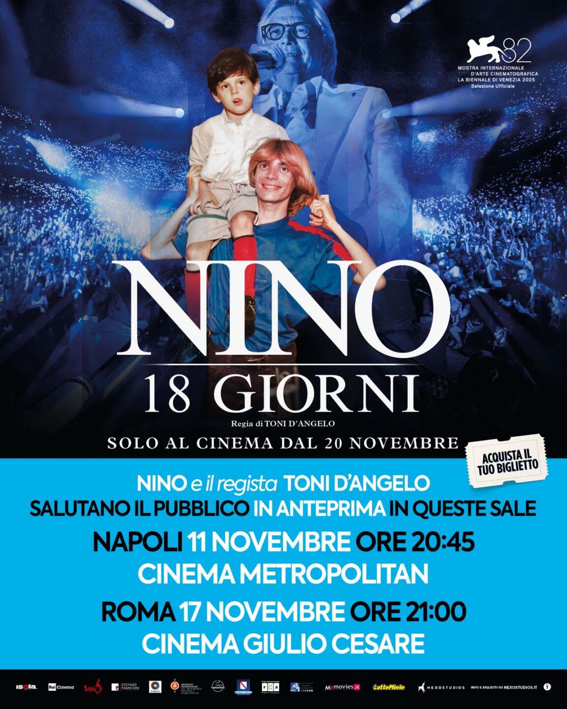 Il documentario NINO. 18 GIORNI, diretto da Toni D’Angelo, verrà presentato in anteprima martedì 11 novembre alle 20.45 al Cinema Metropolitan di Napoli e lunedì 17 novembre alle 21.00 al Cinema Giulio Cesare di Roma, con la presenza in sala dell’artista e del regista. Le prevendite per le proiezioni napoletana e romana sono aperte dal 28 ottobre e sono disponibili sul sito indicato per l’acquisto dei biglietti.