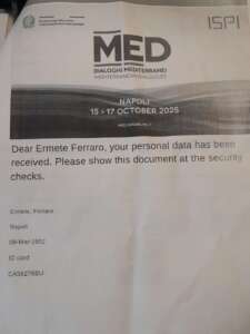 A Palazzo Reale, erano presenti i ministri di Israele e Autorità nazionale palestinese, Gideon Sa’ar e Varsen Aghabekian. I due sono stati accolti dal titolare della Farnesina, Antonio Tajani. Dentro e fuori la sede della conferenza, il dispositivo di sicurezza toccava punte di massima allerta. Ma Ferraro si è avviato tranquillo a Palazzo Reale. Disponeva dell’accredito stampa, di cui mostra la foto. Se lo era procurato in anticipo, “dopo varie conferme online e con le relative credenziali” spiega. È infatti anche redattore e collaboratore della rivista “Nuova Verde Ambiente”. Giunto ai varchi di accesso per ricevere il badge, sarebbero però iniziati i problemi. Stando a lui, l’ingresso ai lavori non gli sarebbe stato consentito. “Per non meglio precisate ‘verifiche’ – racconta – da parte delle autorità della Polizia di Stato che lo presidiavano“. Per lui una lunga attesa sotto la pioggia, e varie interlocuzioni. Quindi il responso finale: nessuna possibilità di entrare. Le motivazioni? “La mancanza di posti a sedere” riferisce contrariato.