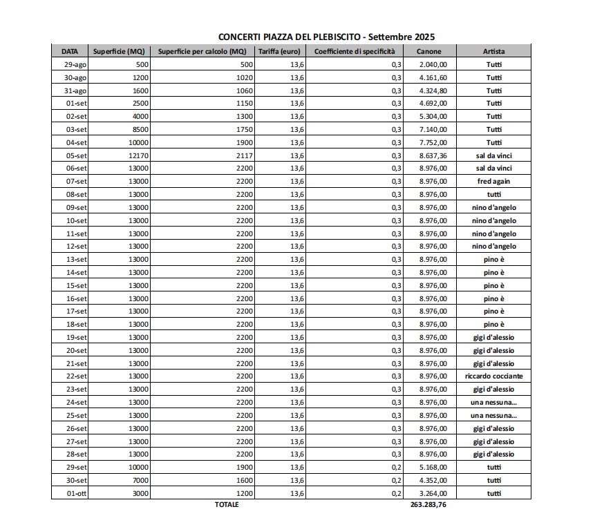 “Super sconto per i concerti al Plebiscito. Dopo una richiesta di accesso agli atti, il Comune ha finalmente messo a disposizione i provvedimenti che hanno permesso i concerti a Piazza del Plebiscito nel mese di settembre. In allegato la disposizione dirigenziale per la concessione della piazza che non è stata resa pubblica perché contiene dati personali. Il dato che emerge è un forte sconto alla società che ha per così dire “noleggiato” lo spazio, e la rinuncia ai rimborsi per gli straordinari dei dipendenti di Asia e della Polizia municipale. E questo è scritto negli atti “con l’obiettivo di favorire lo sviluppo di un turismo musicale nonché di diffondere l’eccellenza della cultura e dell’arte della città e del territorio””.