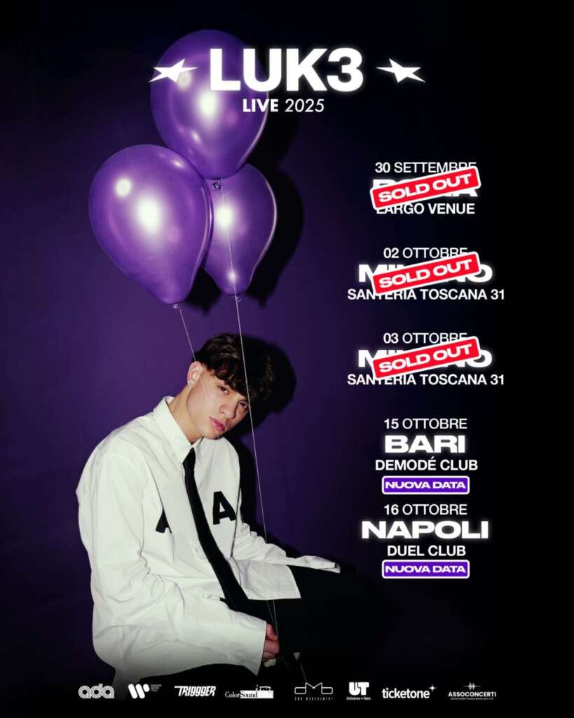 Dopo il tutto esaurito registrato a Roma e Milano, il giovanissimo cantautore LUK3 prosegue il suo tour nei club italiani. Il prossimo appuntamento sarà mercoledì 15 ottobre al Demodé Club di Bari, seguito dal live di giovedì 16 ottobre al Duel Club di Napoli. I biglietti sono disponibili in prevendita su Ticketone e nei punti vendita autorizzati. Le date sono organizzate da Color Sound.