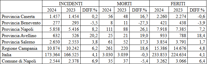 Altrettanto allarmanti sono i dati della sinistrosità stradale a livello regionale. Nell’arco di un anno, infatti, sono aumentati sia gli incidenti (+6,2%) che i feriti (+4,8%), ma soprattutto i decessi: ben il 18,6 per cento che, in valori assoluti, significano 41 vittime in più. Nel dettaglio, lo scorso anno, in Campania sono stati rilevati 10.874 incidenti (erano 10.242 nel 2023), 261 morti (contro i 220 del 2023) e 15.386 feriti (14.676 nel 2023). Benevento è la provincia più virtuosa dove risultano in flessione tutti e tre gli indicatori: -5,5% sinistri, -27,3% morti e -3,9% feriti.