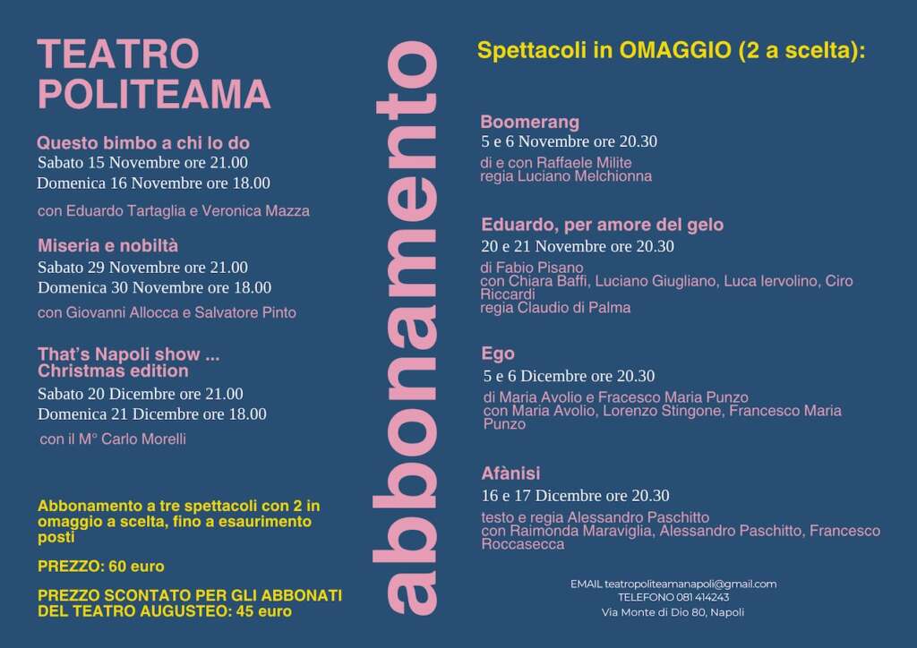 La campagna è attiva con posti limitati: l’offerta è valida fino a esaurimento posti e contempla agevolazioni per chi è già abbonato al Teatro Augusteo di Napoli. Per dettagli su modalità di sottoscrizione, prezzi e posti palco, il Politeama ha reso noto che gli interessati potranno rivolgersi alla biglietteria del teatro o ai canali ufficiali della sala.