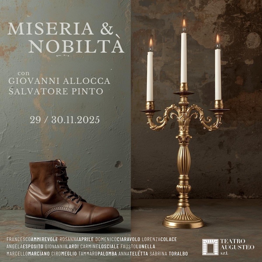 Il 29 e 30 novembre salirà sul palco “Miseria e Nobiltà”, con Giovanni Allocca e Salvatore Pinto — quest’ultimo anche alla regia — e un ampio cast composto da Francesco Ammirevole, Rosanna Aprile, Domenico Ciaravolo, Lorenza Colace, Angela Esposito, Giovanni Ilardi, Carmine Losciale, Fausto Lunella, Marcello Marciano, Ciro Meglio, Tammaro Palomba, Anna Teletta e Sabrina Toralbo. Accompagnata da tre musicisti, la commedia ripropone le vicende di Felice Sciosciammocca, povero scrivano che, per denaro, si finge nobile per favorire un fidanzamento fra giovani di differenti condizioni sociali.