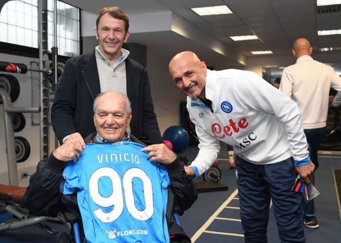 Luciano Spalletti e la squadra hanno accolto Vinicio con un enorme abbraccio al Centro Tecnico donandogli una maglia celebrativa con il numero 90.