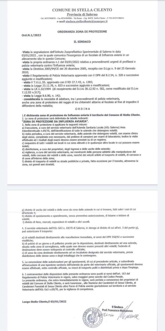 Stella Cilento (Sa) – Come se non bastasse il Sars-Cov-2 Un altro virus mette(rebbe) in pericolo la salute pubblica: l’aviaria. Con ordinanza comunale numero 1 del 2022 del 3 gennaio il sindaco del Comune di Stella Cilento, Francesco Massanova, esercitando le sue funzioni di massima autorità sanitaria municipale ha dichiarato, con decorrenza immediata, tutto il territorio comunale “zona di protezione da influenza aviaria”.