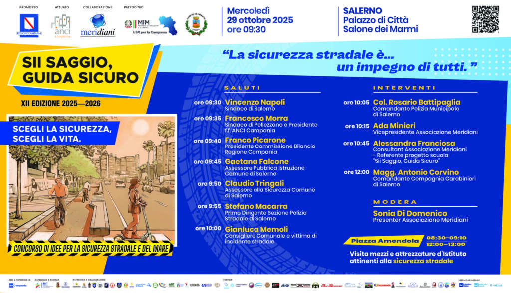 Ai saluti di Vincenzo Napoli, Sindaco di Salerno, Francesco Morra, Sindaco di Pellezzano e Presidente f.f. ANCI Campania, Franco Picarone, Presidente Commissione Bilancio Regine Campania, Gaetana Falcone, Assessore Pubblica Istruzione Comune di Salerno, Claudio Tringali, Assessore alla Sicurezza Comune di Salerno, Stefano Macarra, Primo Dirigente Sezione Polizia Stradale di Salerno e Gianluca Memoli, Consigliere Comunale e vittima di incidente stradale che porterà la sua testimonianza, saliranno in cattedra per la lezione formativa il Colonnello Rosario Battipaglia, Comandante Polizia Municipale di Salerno, Ada Minieri, Vicepresidente Associazione Meridiani e Alessandra Franciosa, Consultant Associazione Meridiani – Referente progetto scuola “Sii Saggio, Guida Sicuro”. Per le Forze dell’Ordine interverrà il Maggiore Antonio Corvino, Comandante della Compagnia Carabinieri di Salerno. Modera l’incontro Sonia Di Domenico, presenter Associazione Meridiani.