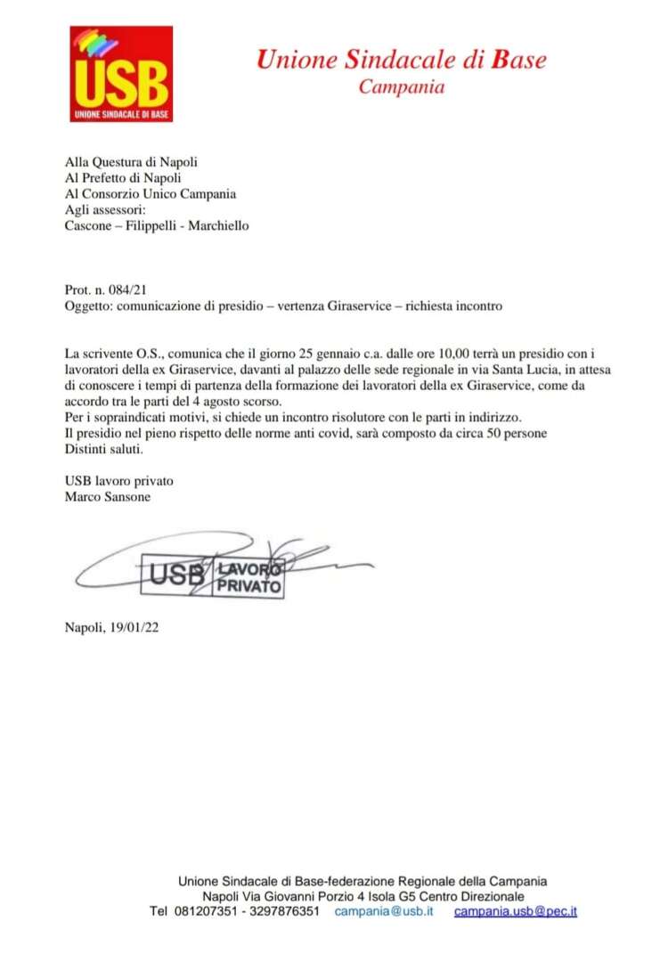 Comunicazione formalmente avanzata dalla sigla sindacale USB a Prefettura e Questura di Napoli, al Consorzio Unico Campania e alla Regione (Cascone, Filippelli, Marchiello). La Usb scrive: “Alle ore 10 del 25 gennaio, 50 lavoratori ex Giraservice terranno un presidio davanti alla sede regionale di Santa Lucia in attesa di conoscere i tempi di partenza della formazione, come da accordo tra le parti del 4 agosto 2021. I lavoratori chiedono un  risolutivo incontro tra le parti”.