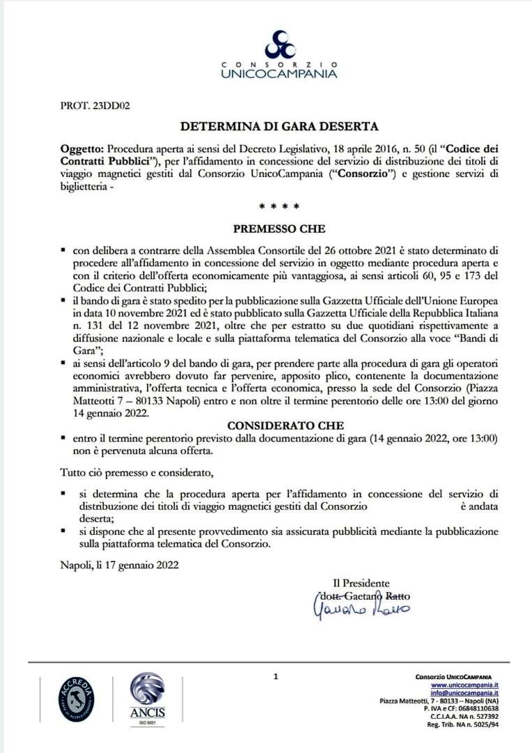 Salerno – Il verbale del Consorzio Unico Campania del 17 gennaio 2022 ha un oggetto significativo: “Determina di Gara Deserta”. La gara (europea) a cui il verbale fa riferimento, indetta a novembre 2021, riguarda la “procedura di affidamento dei servizi in concessione del servizio di distribuzione dei titoli di viaggio magnetici gestiti dal Consorzio Unico e gestione servizi di biglietteria”.