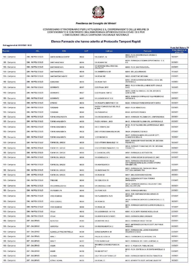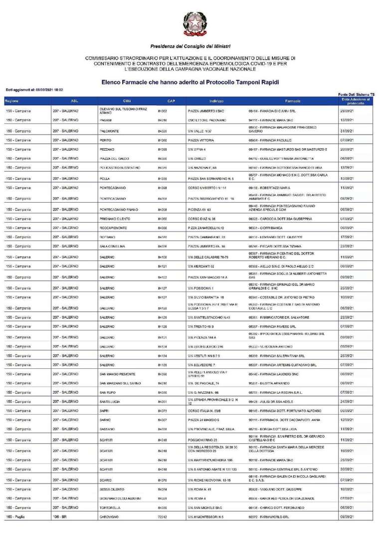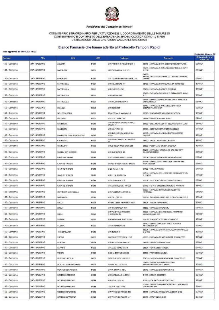 Salerno – Il Commissario straordinario per l’attuazione e il coordinamento delle misure di contenimento e contrasto dell’emergenza epidemiologica Covid-19 e per l’esecuzione della campagna vaccinale nazionale ha diffuso l’elenco farmacie che, in Campania, hanno aderito al ‘Protocollo Tamponi Rapidi’.