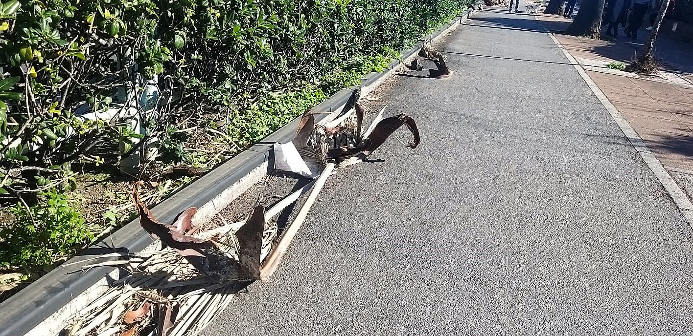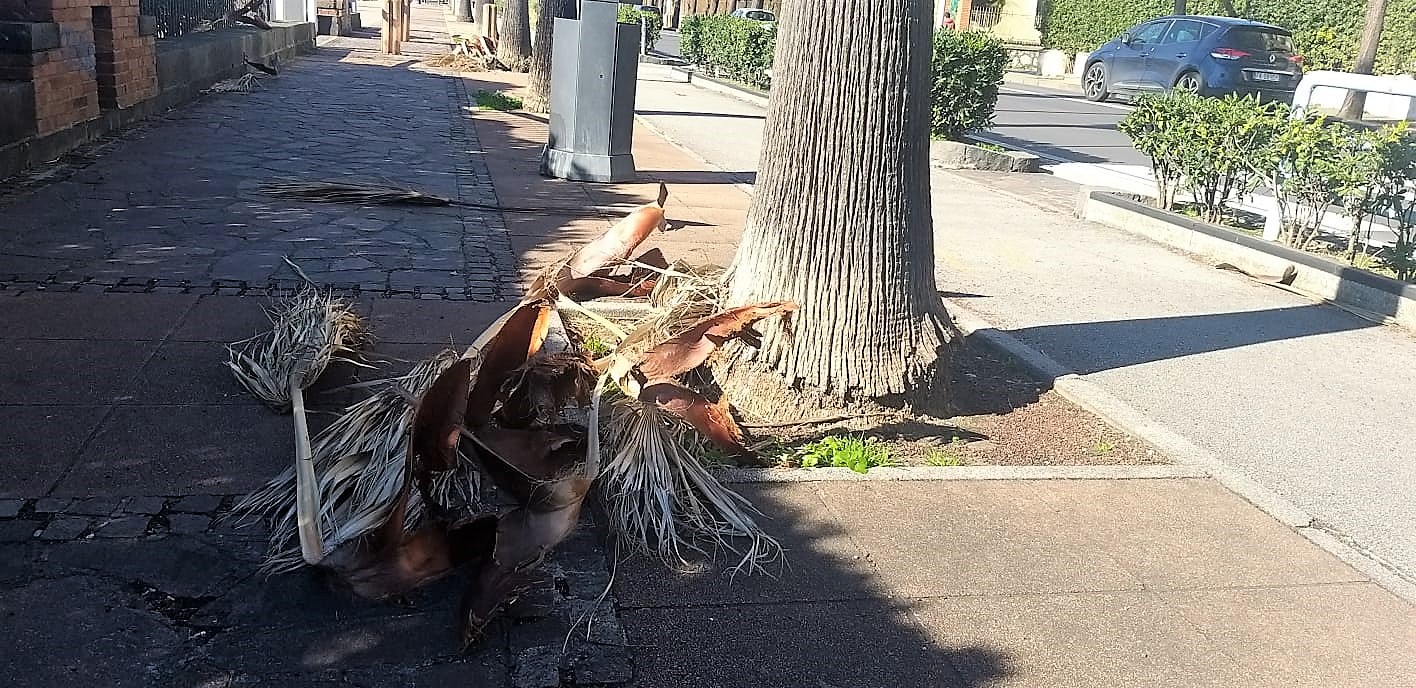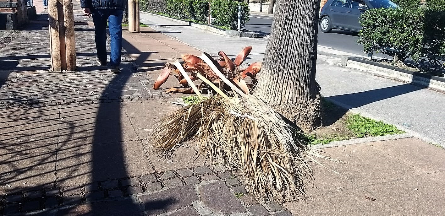 In zona, nel giorno successivo alla burrasca di vento che ha interessato tutta la città si scorgono, a decine, i rami secchi delle palme che le raffiche hanno, abbastanza agevolmente, staccato dai tronchi.